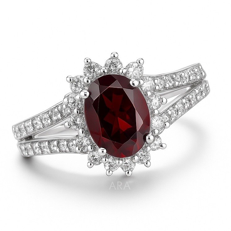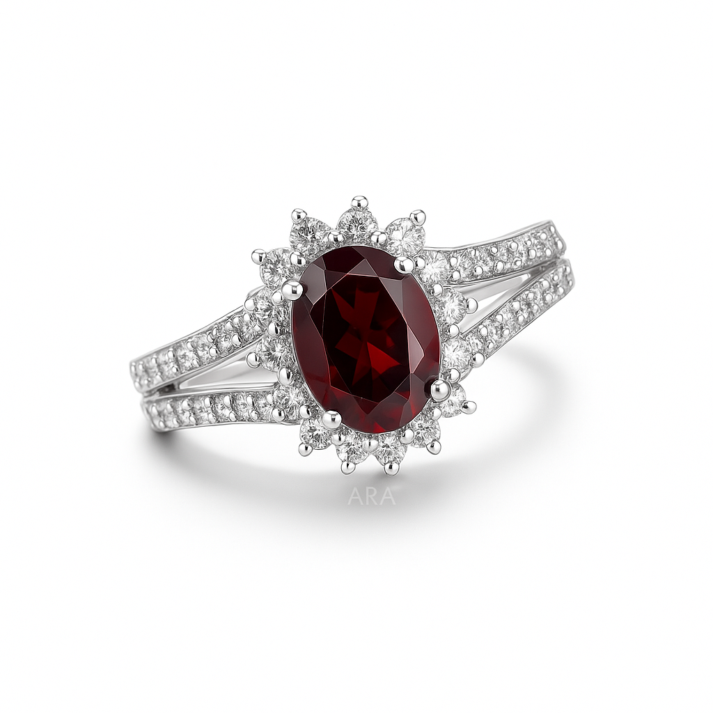 At the core of a scintillating floral halo is an oval garnet, held in a prong setting. This oval citrine ring is inspired by Princess Diana’s beautiful engagement ring. It is crafted in 925 silver and bespeaks glamour and elegance.