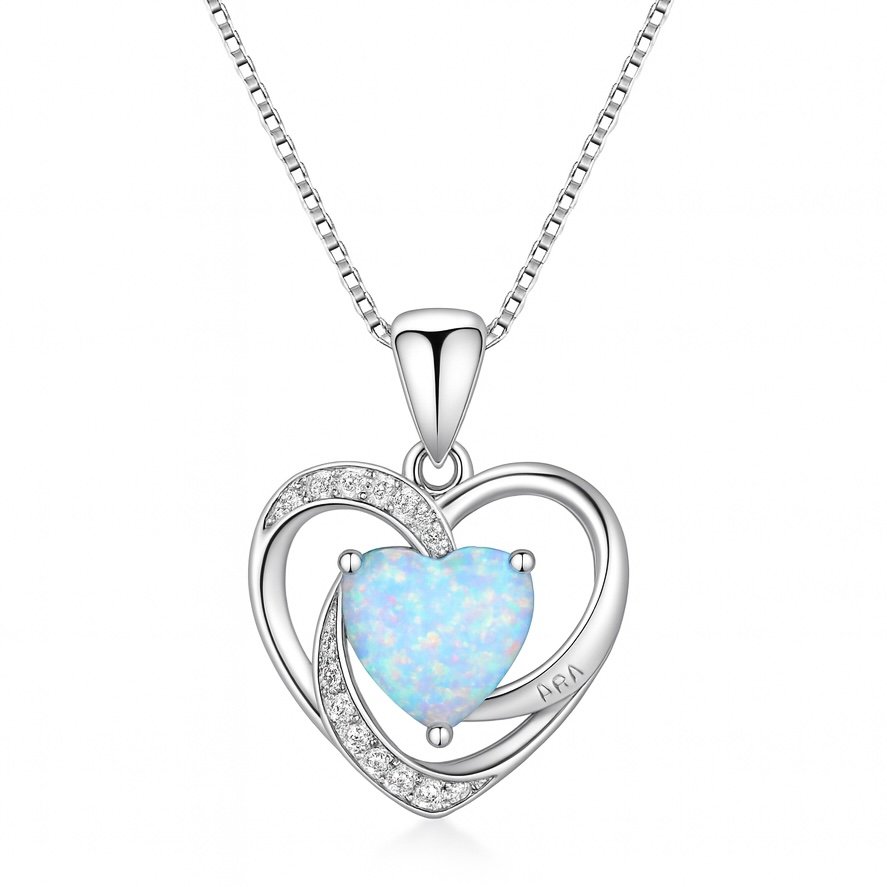 This silver pendant features a heart-shaped design with a opal in the centre, adorned with natural zirconia.