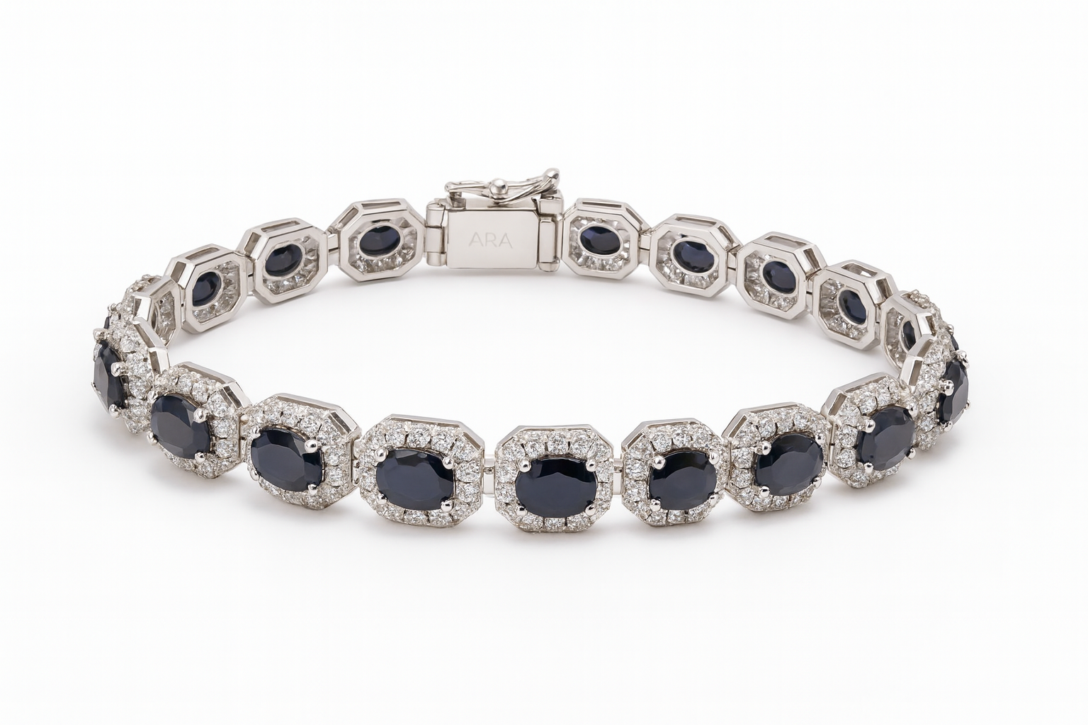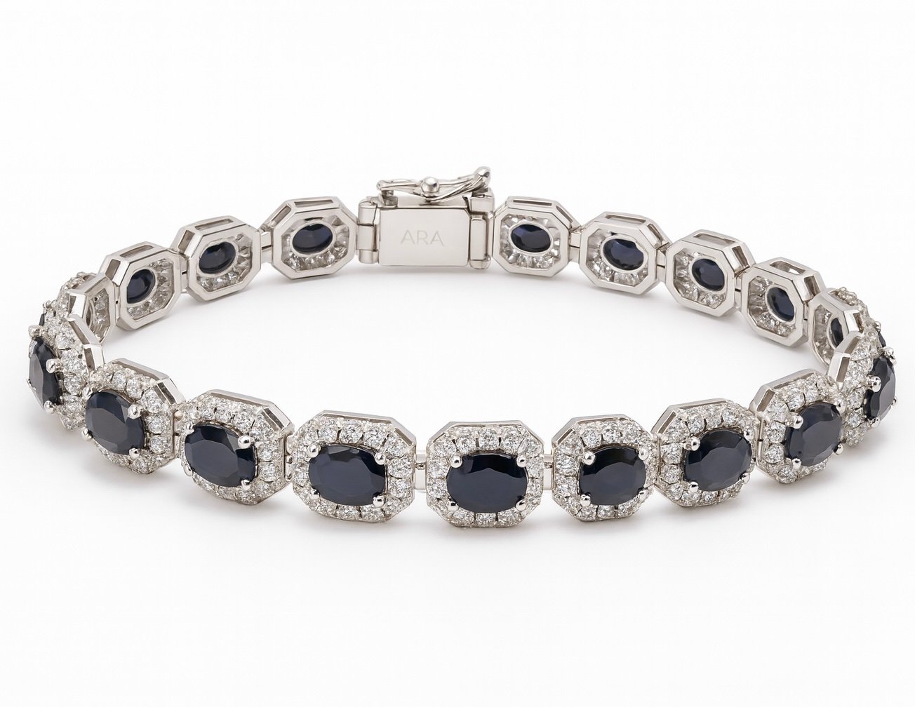 Be the first to review “Bezel-Set Blue Sapphire and Diamond Halo Tennis Bracelet” Cancel reply