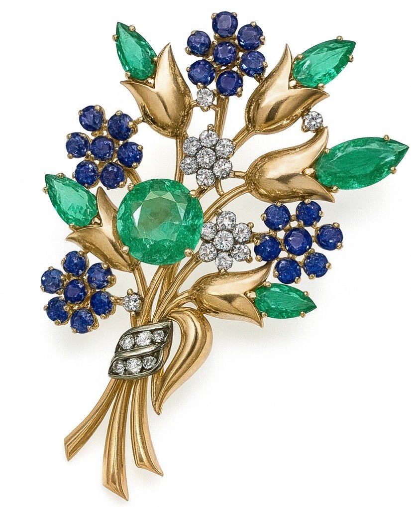 Emerald-Sapphire-Diamond Gold Leaf-Design Brooch