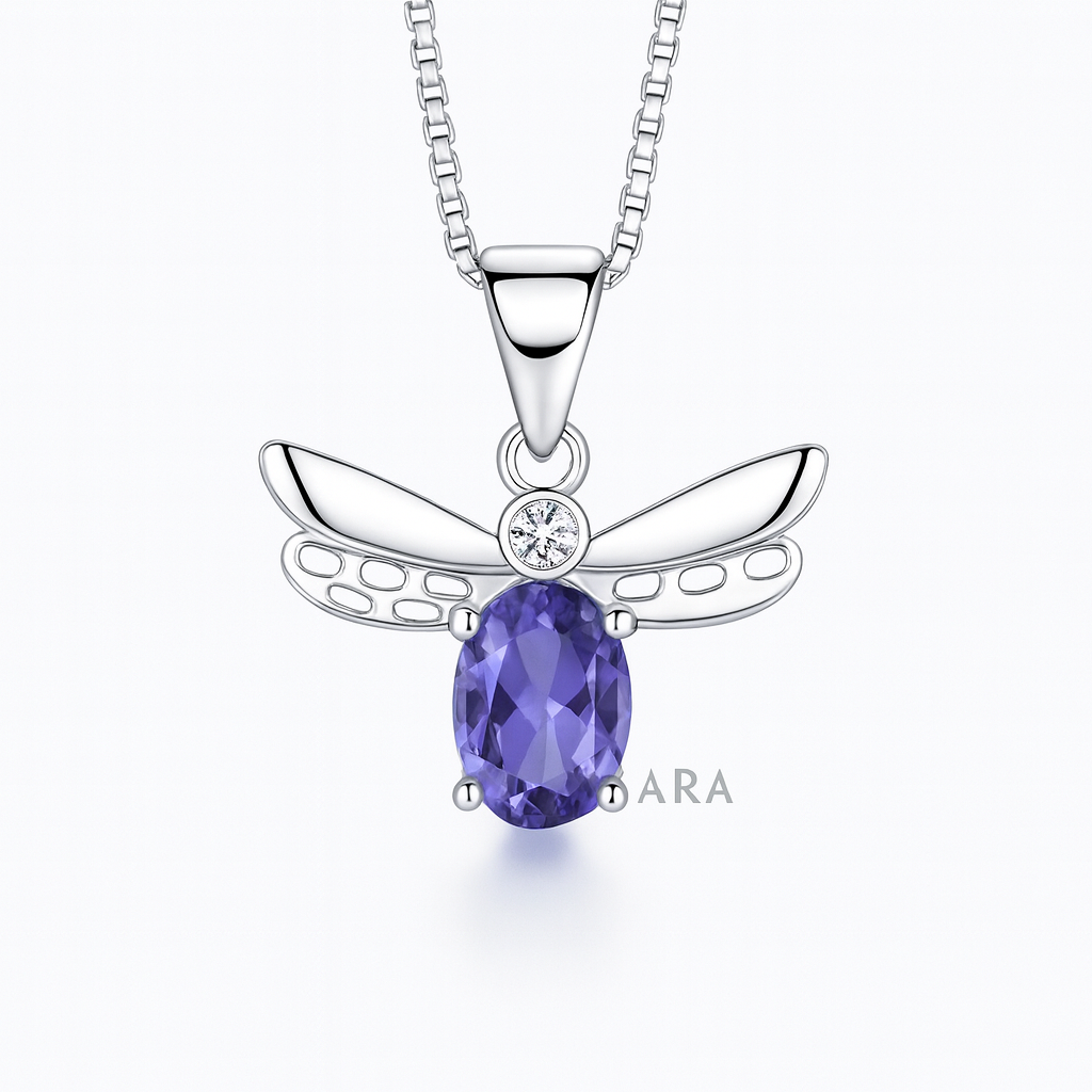 Vintage Inspired Oval Tanzanite and Zirconia Butterfly Pendant Necklace